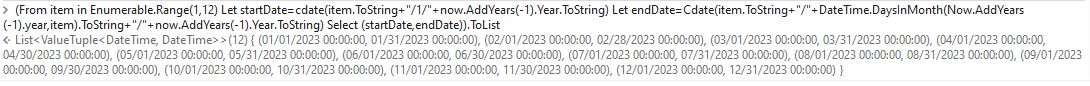 Let endDate=Cdate(item.ToString+"/"+DateTime.DaysInMonth(Now.AddYears(-1).year,item).ToString+"/"+now.AddYears(-1).Year.ToString)