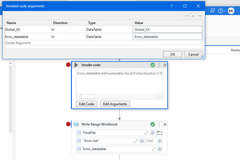 Error_datatable.AsEnumerable.ToList.ForEach(sub(r) r(“Entity”) = If(Global_Dt.AsEnumerable.Where(function(x) x(“Name”).ToString.Equals(r(“Employee Name”).ToString)).Count>0,Global_Dt.AsEnumerable.Where(function(x) x(“Name”).ToString.Equals(r(“Employee Name”).ToString))(0)(“Location”).ToString,“”))