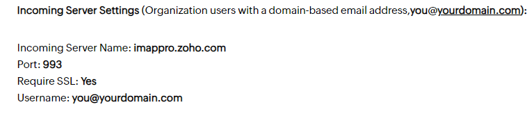 Unfortunately I can’t see the image with the error. While I am not too familiar with zoho email, in general IMAP servers work the same, consider the following: