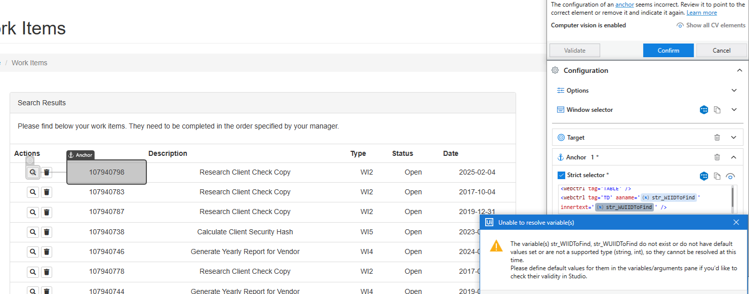 Practing on ACME, I already Extract the table on Work Items, already Filtered to WI5/Open items and now I want to click in the action button to see whats inside but only in the WI5/Open rows. I am trying to use the click activity inside the For Each Row, and my Sequence is correecly identifiying the page that the WI5 is (exemple, the first WI5 is only on page 3). But when the automation get in Page 3 it clicks…this first item on the table and not the WI5 one. I tryied everything, even Dynamic Selector. The With the Debug I saw the the variable is correct and have the correct scope (the For Each Row)