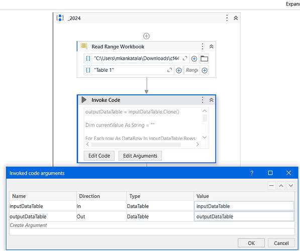→ Use read range workbook activity to read the excel and store in a datatable, make sure to remove add headers. The Output Variable we will call it as inputDataTable.