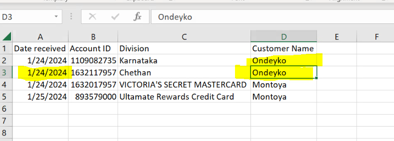 Condition: Table have Date received, Customer name, Account ID and Division.