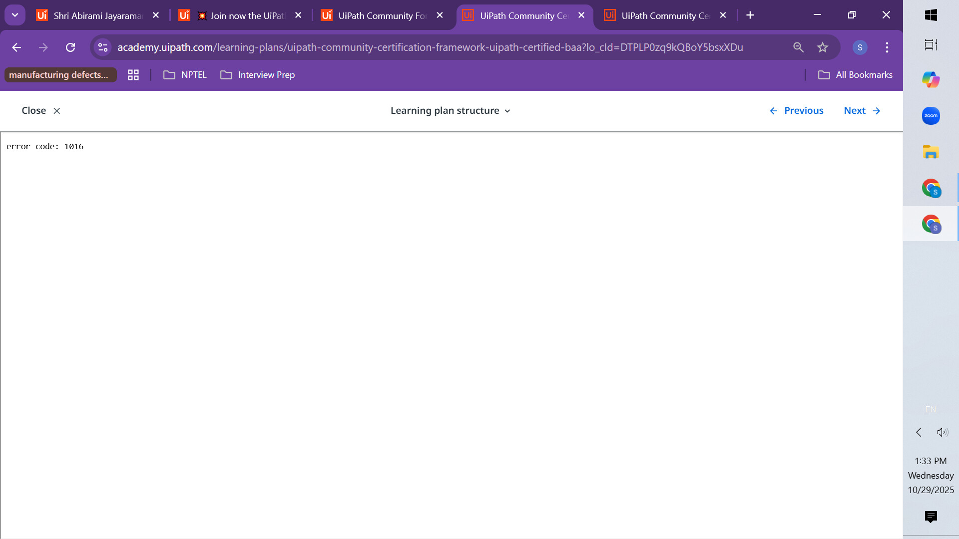 You are seeing error codes like 1816 on UiPath Academy due to platform or browser issues.