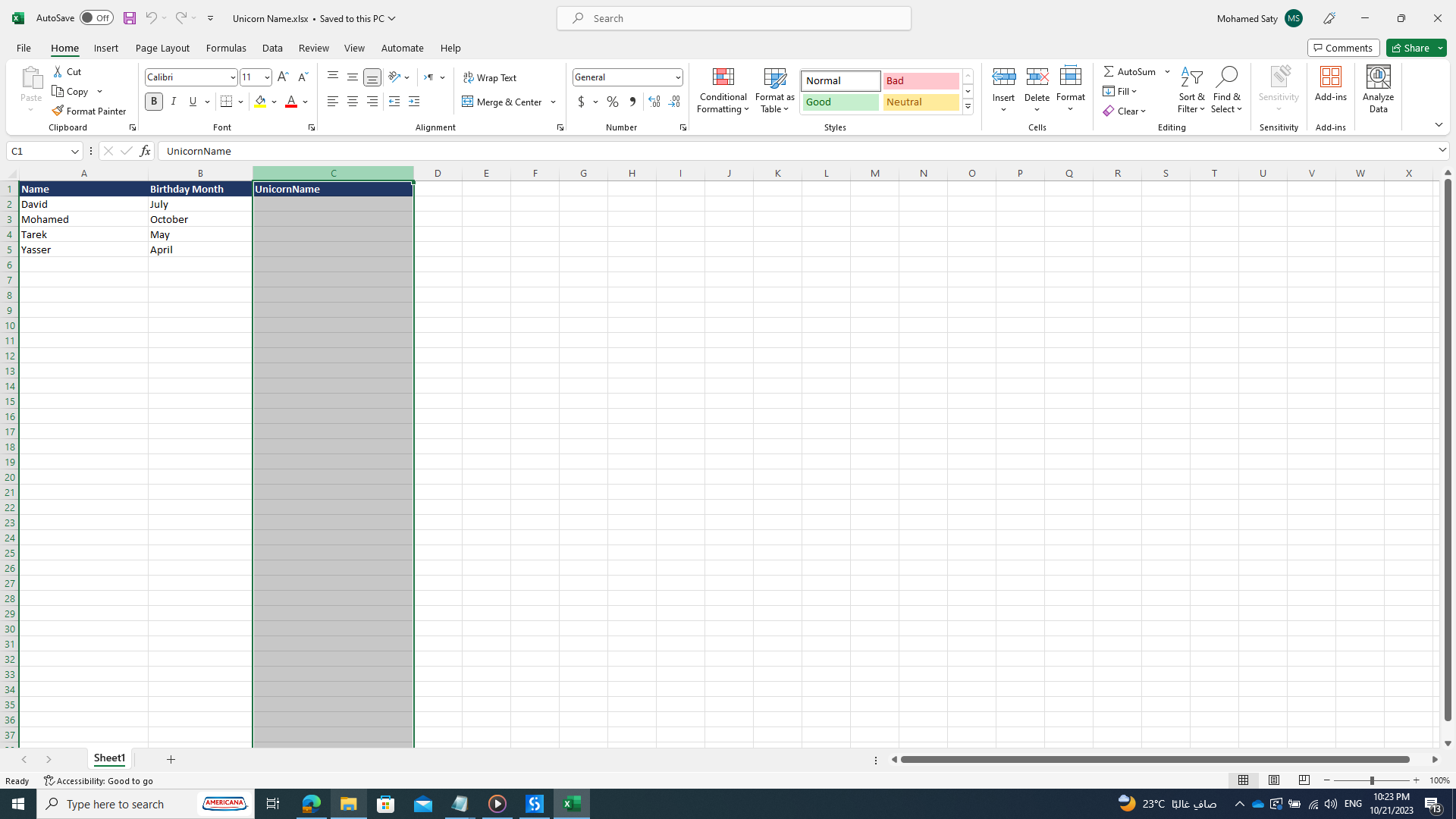 At UiPath course they give an example for how to create unicorn name only for on user. i have managed to create a unicorn name for many names. but i need to take the unicorn names for those users and insert them to the same excel sheet in a new column.