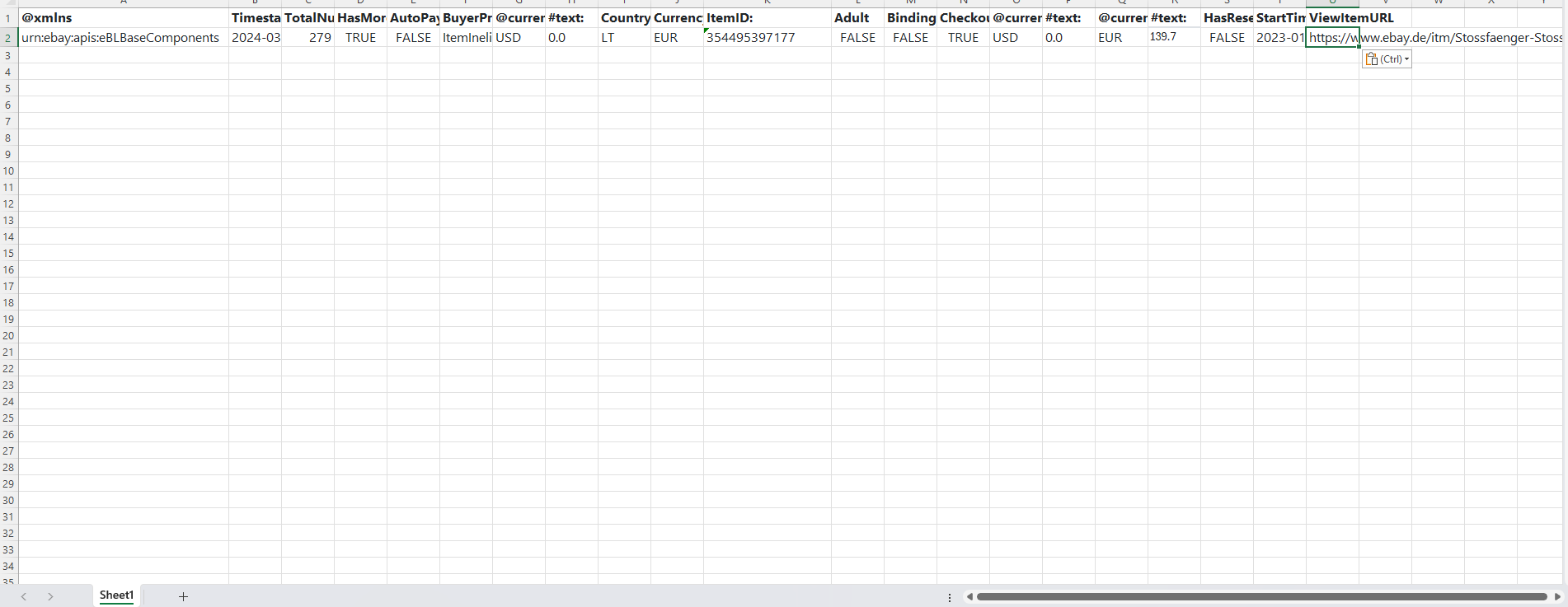 <GetSellerListResponse xmlns="urn:ebay:apis:eBLBaseComponents"><Timestamp>2024-03-21T07:23:26.362Z</Timestamp><Ack>Success</Ack><Version>1271</Version><Build>E1271_CORE_APISELLING_19187371_R1</Build><HardExpirationWarning>2024-03-21 14:50:04</HardExpirationWarning><PaginationResult><TotalNumberOfPages>279</TotalNumberOfPages><TotalNumberOfEntries>279</TotalNumberOfEntries></PaginationResult><HasMoreItems>true</HasMoreItems><ItemArray><Item><AutoPay>false</AutoPay><BuyerProtection>ItemIneligible</BuyerProtection><BuyItNowPrice currencyID="USD">0.0</BuyItNowPrice><Country>LT</Country><Currency>EUR</Currency><Description><font rwr="1" style=""> <p style="text-align: center; background: rgb(255, 255, 255); text-indent: 27pt; vertical-align: baseline;"> <font face="Arial"> <span style="font-size: 18.6667px;">Artikel: <span style="white-space: pre;"> </span> <b>STOSSSTANGE</b> </span> </font> </p><p style="text-align: center; background: rgb(255, 255, 255); text-indent: 27pt; vertical-align: baseline;"> <font face="Arial"> <span style="font-size: 18.6667px;">Hersteller: <span style="white-space:pre"> </span> <b>unbranded</b> </span> </font></p><p style="text-align: center; background: rgb(255, 255, 255); text-indent: 27pt; vertical-align: baseline;"> <font face="Arial"> <span style="font-size: 18.6667px;">OEM Nummer: <span style="white-space:pre"> </span> <b>86511-2Y000</b> </span> </font></p><p style="text-align: center; background: rgb(255, 255, 255); text-indent: 27pt; vertical-align: baseline;"> <font face="Arial"> <span style="font-size: 18.6667px;">Farbe <span style="white-space:pre"> </span> <b>Grau, Grundiert</b> </span> </font></p><p style="text-align: center; background: rgb(255, 255, 255); text-indent: 27pt; vertical-align: baseline;"> <font face="Arial"> <span style="font-size: 18.6667px;">Einbauseite <span style="white-space: pre;"> </span> <b> - </b> </span> </font></p></font></Description><ItemID>354495397177</ItemID><ListingDetails><Adult>false</Adult><BindingAuction>false</BindingAuction><CheckoutEnabled>true</CheckoutEnabled><ConvertedBuyItNowPrice currencyID="USD">0.0</ConvertedBuyItNowPrice><ConvertedStartPrice currencyID="EUR">139.7</ConvertedStartPrice><ConvertedReservePrice currencyID="EUR">0.0</ConvertedReservePrice><HasReservePrice>false</HasReservePrice><StartTime>2023-01-04T09:43:30.000Z</StartTime><EndTime>2024-04-04T08:43:30.000Z</EndTime><ViewItemURL>https://www.ebay.de/itm/Stossfaenger-Stossstange-vorne-HYUNDAI-TUCSON-2010-2015-865112Y000-/354495397177</ViewItemURL><HasUnansweredQuestions>false</HasUnansweredQuestions><HasPublicMessages>false</HasPublicMessages><ViewItemURLForNaturalSearch>https://www.ebay.de/itm/Stossfaenger-Stossstange-vorne-HYUNDAI-TUCSON-2010-2015-865112Y000-/354495397177</ViewItemURLForNaturalSearch></ListingDetails><ListingDesigner><LayoutID>7710000</LayoutID><ThemeID>7710</ThemeID></ListingDesigner><ListingDuration>GTC</ListingDuration><ListingType>FixedPriceItem</ListingType><Location>Kaunas</Location><PrimaryCategory><CategoryID>33640</CategoryID><CategoryName>Auto & Motorrad: Teile:Autoteile & Zubehör:Karosserie-, Anbauteile & Zubehör:StoĂstangen & Teile:StoĂstangen & -verstĂ€rker</CategoryName></PrimaryCategory><PrivateListing>false</PrivateListing><Quantity>2</Quantity><IsItemEMSEligible>false</IsItemEMSEligible><ReservePrice currencyID="EUR">0.0</ReservePrice><ReviseStatus><ItemRevised>true</ItemRevised></ReviseStatus><SellingStatus><BidCount>0</BidCount><BidIncrement currencyID="EUR">0.0</BidIncrement><ConvertedCurrentPrice currencyID="EUR">139.7</ConvertedCurrentPrice><CurrentPrice currencyID="EUR">139.7</CurrentPrice><LeadCount>0</LeadCount><MinimumToBid currencyID="EUR">139.7</MinimumToBid><QuantitySold>0</QuantitySold><ReserveMet>true</ReserveMet><SecondChanceEligible>false</SecondChanceEligible><ListingStatus>Active</ListingStatus></SellingStatus><ShippingDetails><ApplyShippingDiscount>false</ApplyShippingDiscount><CalculatedShippingRate><WeightMajor measurementSystem="Metric" unit="kg">0</WeightMajor><WeightMinor measurementSystem="Metric" unit="gm">0</WeightMinor></CalculatedShippingRate><SalesTax><SalesTaxPercent>0.0</SalesTaxPercent><ShippingIncludedInTax>false</ShippingIncludedInTax></SalesTax><ShippingServiceOptions><ShippingService>DE_StandardversandAusDemAusland</ShippingService><ShippingServiceCost currencyID="EUR">0.0</ShippingServiceCost><ShippingServiceAdditionalCost currencyID="EUR">0.0</ShippingServiceAdditionalCost><ShippingServicePriority>1</ShippingServicePriority><ExpeditedService>false</ExpeditedService><ShippingTimeMin>4</ShippingTimeMin><ShippingTimeMax>10</ShippingTimeMax><FreeShipping>true</FreeShipping></ShippingServiceOptions><ShippingServiceOptions><ShippingService>DE_DPBuecherWarensendung</ShippingService><ShippingServiceCost currencyID="EUR">29.0</ShippingServiceCost><ShippingServiceAdditionalCost currencyID="EUR">29.0</ShippingServiceAdditionalCost><ShippingServicePriority>2</ShippingServicePriority><ExpeditedService>false</ExpeditedService><ShippingTimeMin>2</ShippingTimeMin><ShippingTimeMax>4</ShippingTimeMax></ShippingServiceOptions><InternationalShippingServiceOption><ShippingService>DE_PaketInternational</ShippingService><ShippingServiceCost currencyID="EUR">59.0</ShippingServiceCost><ShippingServiceAdditionalCost currencyID="EUR">59.0</ShippingServiceAdditionalCost><ShippingServicePriority>1</ShippingServicePriority><ShipToLocation>Worldwide</ShipToLocation></InternationalShippingServiceOption><ShippingType>Flat</ShippingType><ThirdPartyCheckout>false</ThirdPartyCheckout><ShippingDiscountProfileID>0</ShippingDiscountProfileID><InternationalShippingDiscountProfileID>0</InternationalShippingDiscountProfileID><ExcludeShipToLocation>Ostfriesische Inseln</ExcludeShipToLocation><ExcludeShipToLocation>Nordfriesische Inseln</ExcludeShipToLocation><ExcludeShipToLocation>Hiddensee</ExcludeShipToLocation><ExcludeShipToLocation>Africa</ExcludeShipToLocation><ExcludeShipToLocation>Asia</ExcludeShipT