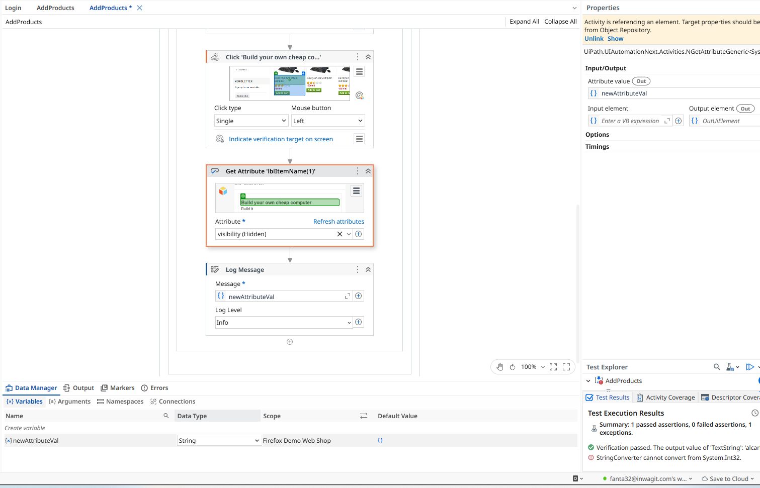 Hi Team, I’m a beginner UiPath user and exploring its functionalities for our possible next test automation tool, I would kindly ask for help on handling the Get Attribute activity. I have issues on Web UI elements with attribute that returns boolean or int32. For example I use Get Attribute activity to get the attribute: visibility which returns 0 or 1, and relativeVisibility which returns True or False. Every time I use this I encounter an error: