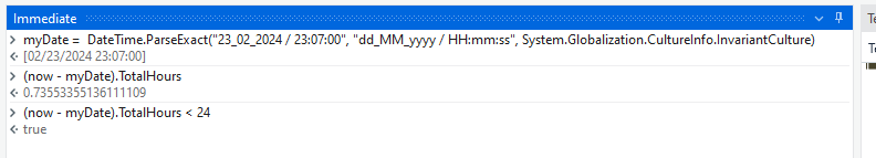 Output = If (DateTime.Now.Subtract(DateTime.ParseExact("23_02_2024 / 23:07:00", "dd_MM_yyyy / HH:mm:ss", System.Globalization.CultureInfo.InvariantCulture)).TotalHours >= 24, "24 hours have elapsed.", "24 hours have not elapsed yet.")