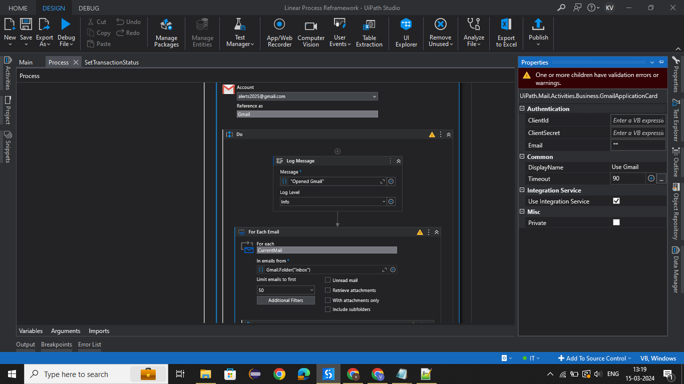 Which activity are you using for reading mails? Share me screenshot- properties of reading mails activity.
