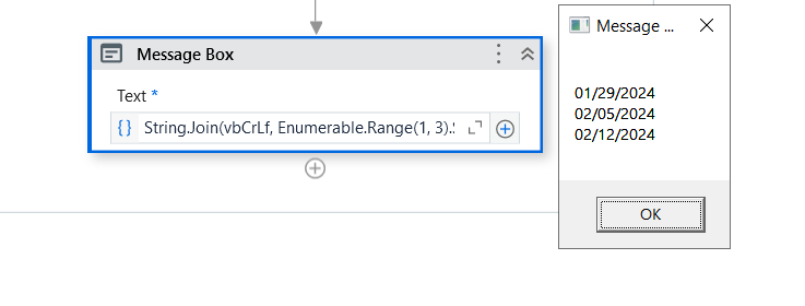 Assign-> String.Join(vbCrLf, Enumerable.Range(1, 3).Select(Function(week) Enumerable.Range(1, 7).Select(Function(day) New DateTime(DateTime.Now.Year, DateTime.Now.Month, 1).AddDays((day - CInt(New DateTime(DateTime.Now.Year, DateTime.Now.Month, 1).DayOfWeek) + 7 * (week - 1)))).First().ToString("MM/dd/yyyy")).ToList())