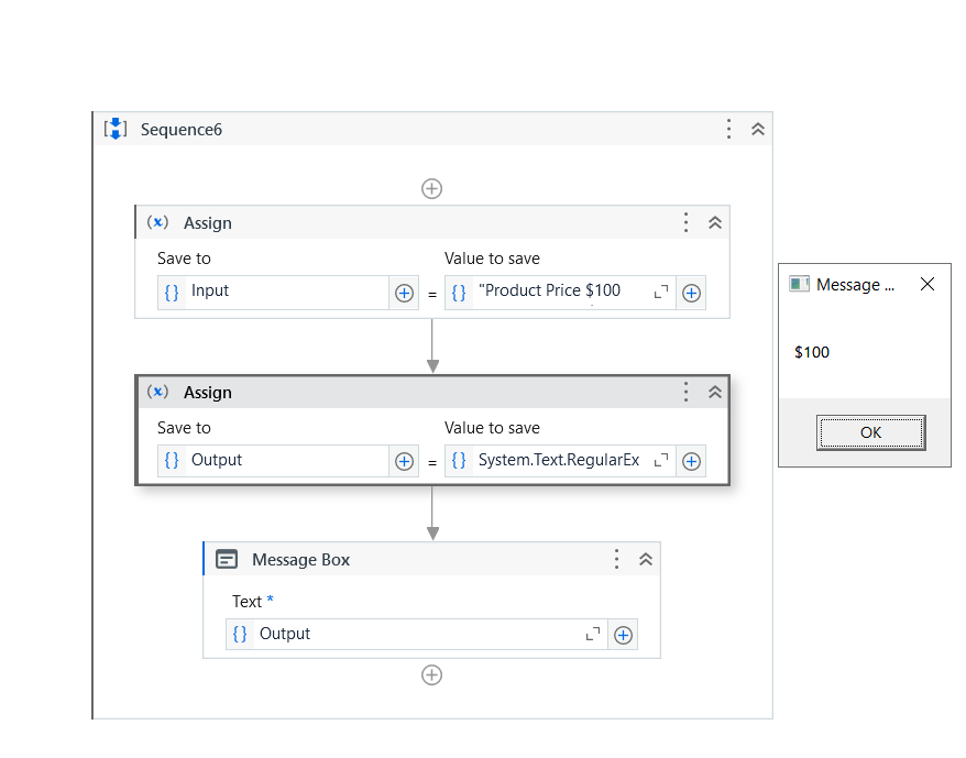 Assign-> Output = System.Text.RegularExpressions.Regex.Match(Input,"(?<=Product Price\s+)\$?\d+").Value.Trim()