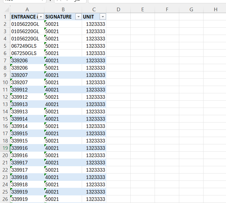 Signature column consist 40021 with blue color and 50021 doesnt have the blue color…and both have the duplicates …I am trying to group them togather as