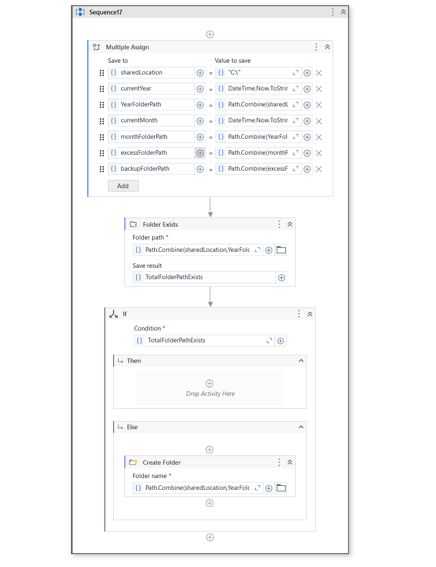→ After the Multiple Assign I have used Folder Exists and If. If the folder is already present, it won’t create a new folder. Same in the case of Excess and Backup folder.
