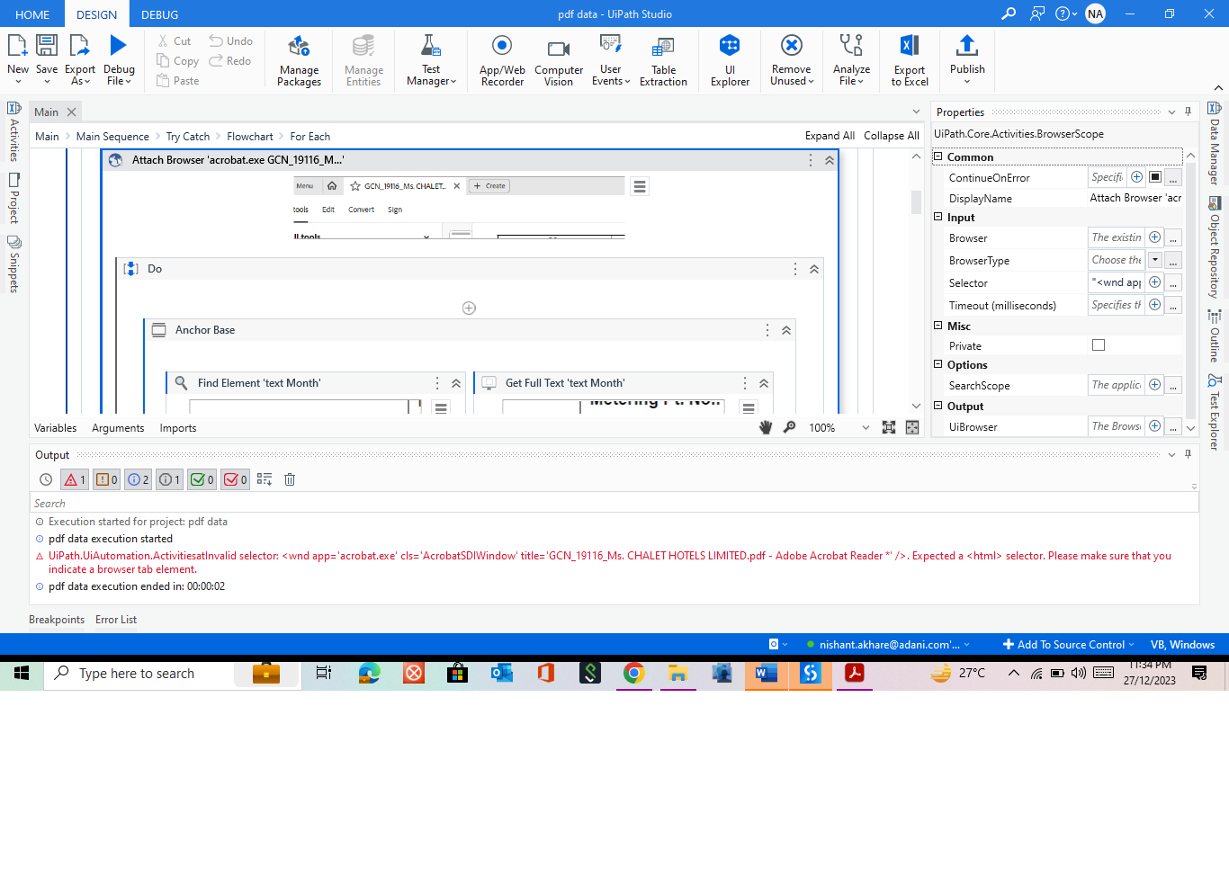 The problem is happening because the activity is expecting a selector related to a Browser. From the print, OP is trying to use with a Windows app, it will not work.