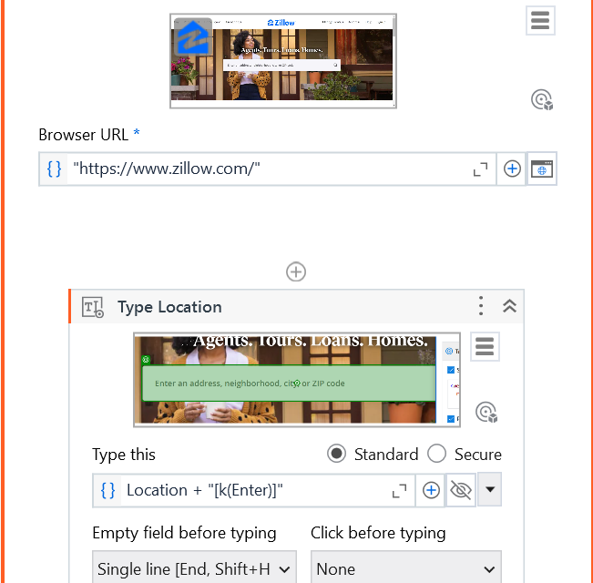 i am attempting this web data scraping project from Udemy. first i placed the input dialog and then after placing the name of a city, UiPath then places the city onto the search bar at zillow.com and then goes to the next page. It doesn’t do that. instead it just stays at the home page and at the end of the URL, i got a question mark. any ideas of what my discrepancy is?