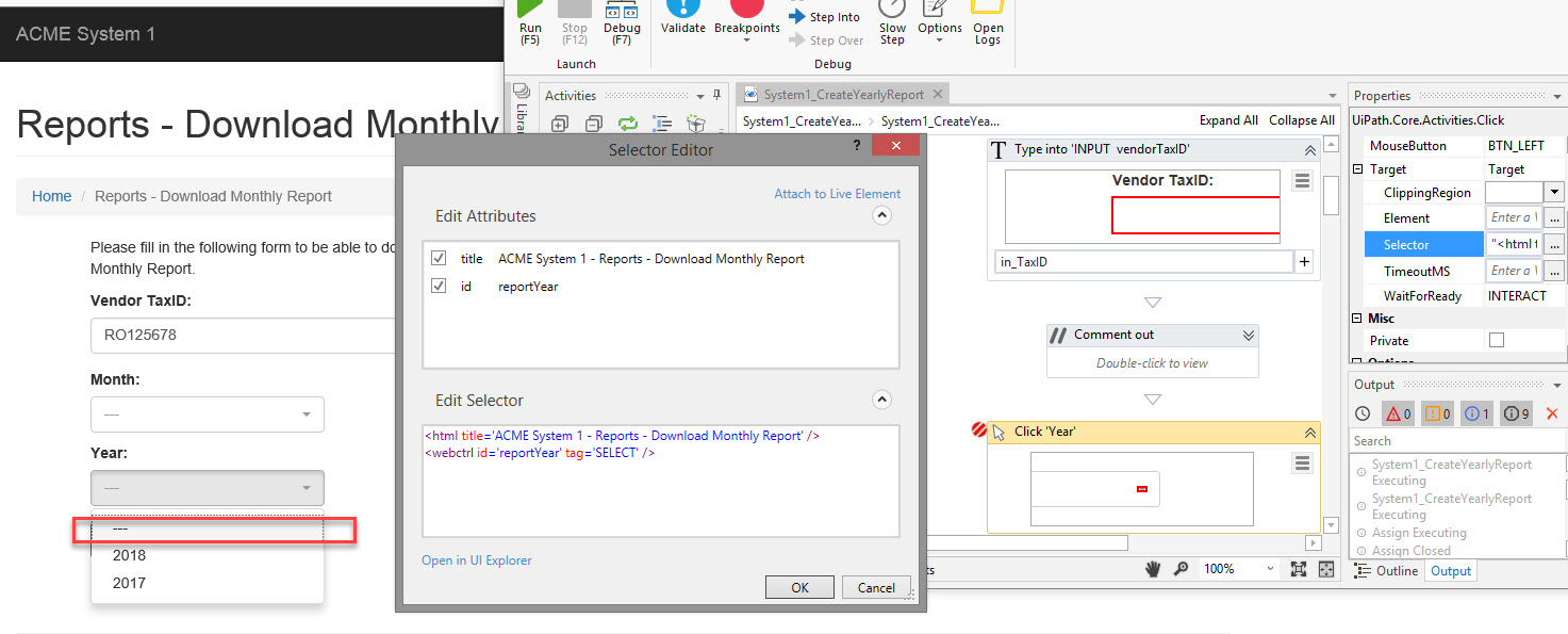 Hi, i try to build the the System1_CreateYearlyReport.xaml in the process workflow. The problem is the right selector regarding the click activity Target year. The expression in the walktrough doesen’t work. It seems “+in_Year+” is the problem, But why ? Can anyone check my screenshot.