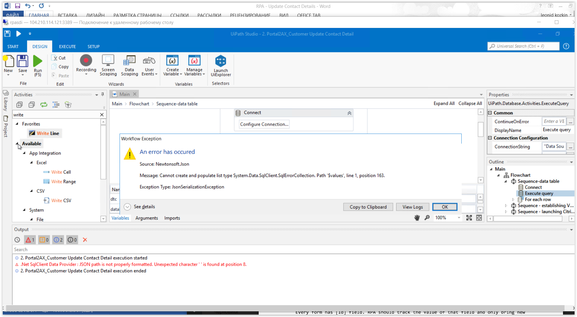 Have you tried running it in Management Studio - easier to get the query running there by breaking it down and then importing into UiPath. This is a SQL syntax error - Iβll have a look if I get time.