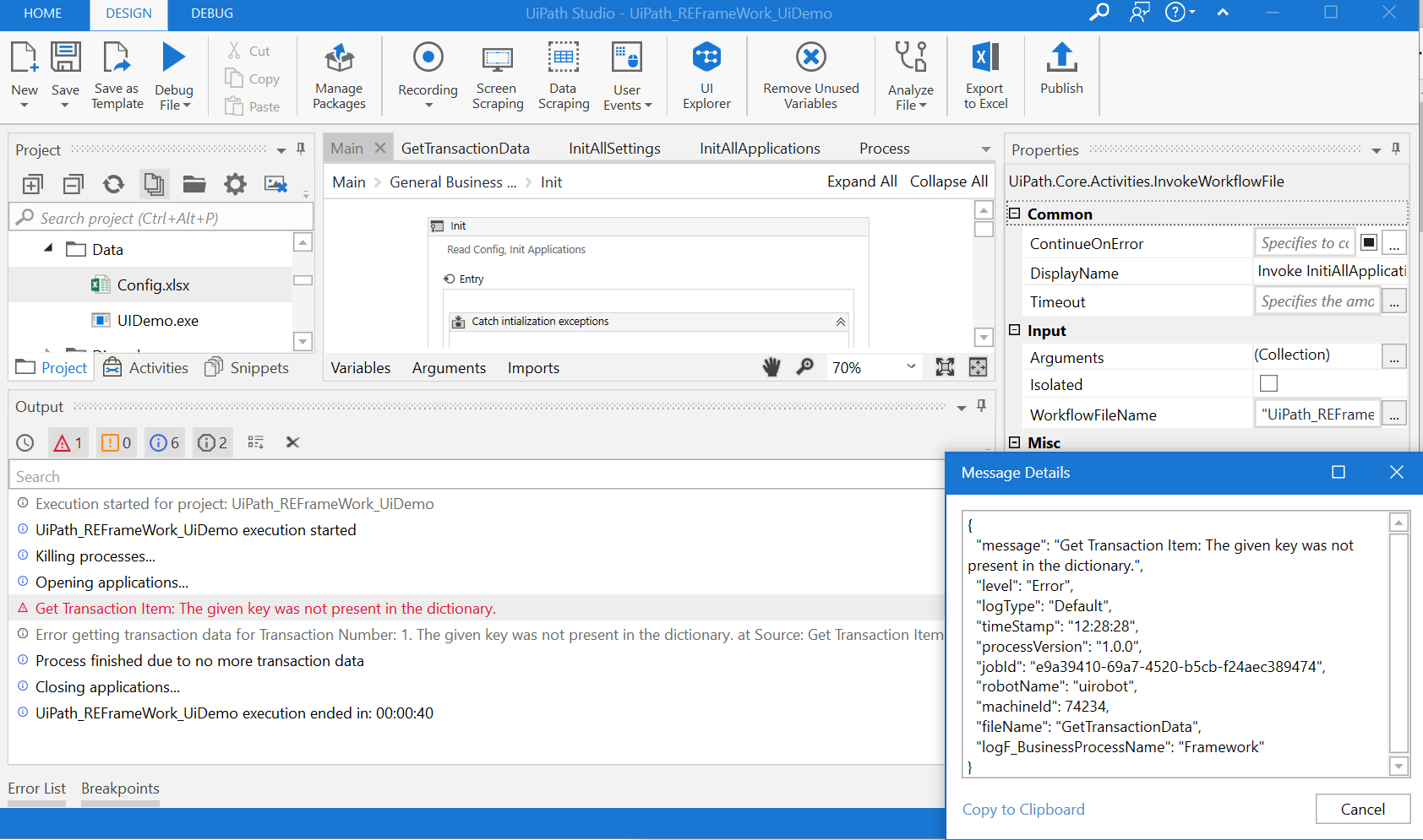 I am having two issues, first the Demo opens, logs in, then closes. I set a breakpoint in InitAllSettings at the Get Asset Value Activity, and I get the Asset Name cannot be null or empty.