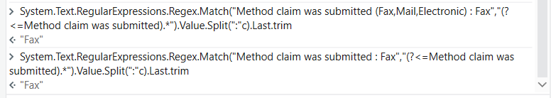 System.Text.RegularExpressions.Regex.Match(“Method claim was submitted (Fax,Mail,Electronic) : Fax”,“(?<=Method claim was submitted).*”).Value.Split(":"c).Last.trim