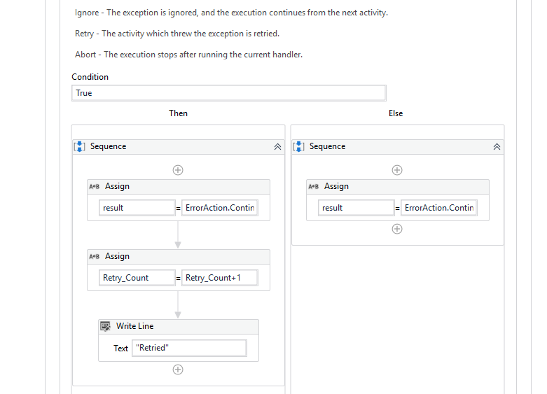 Setting both actions in the ‘If’ activity to errorinfo.Continue