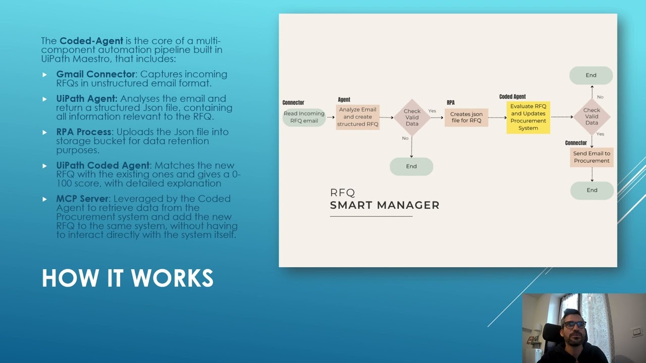 Using Coded Agent, it’s possible to leverage MCP server directly from the agent, having the ability to parse previous RFQs from the system, pass all the data to the agent in order to perform an analysis of the new RFQ, and also maintain the portal in real time, using the MCP server for a direct and faster update.