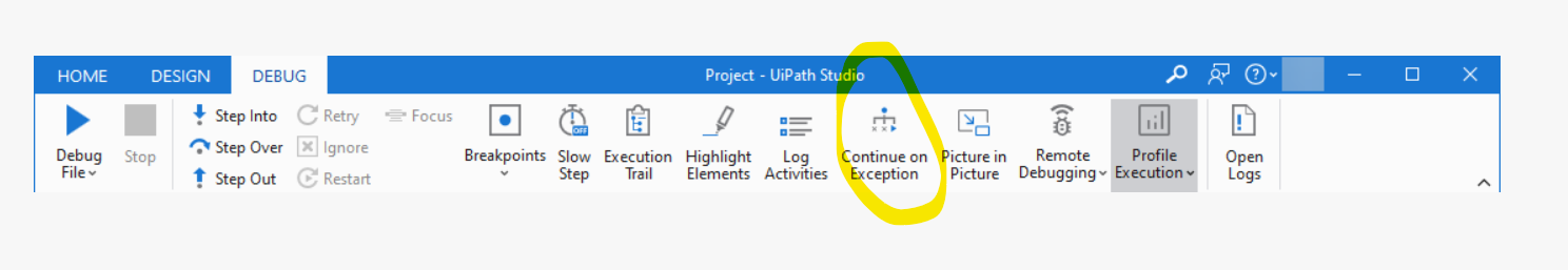 However, in my case, it doesn’t work that way. When an error occurs, the process simply continues automatically, following the exception handling path without pausing or displaying any of the expected options.