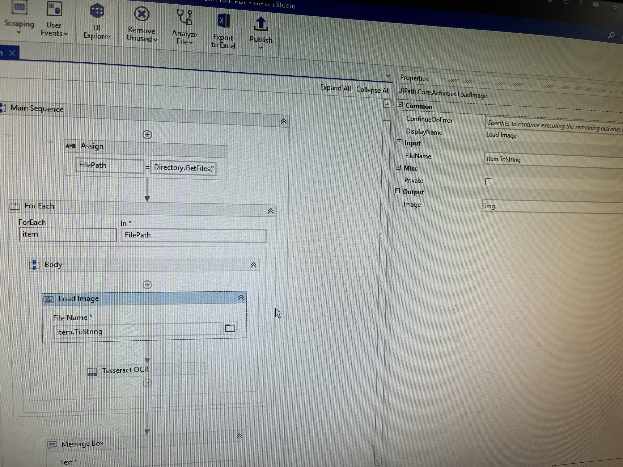 In my environment. it works as the following. Did you set same image type variable at Image property of LoadImage activity and Image property of TesseractOCR activity?