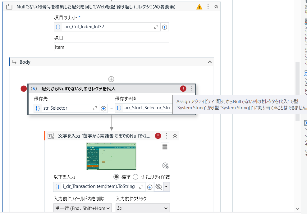 For Eachアクティビティの中で、配列からString変数に値を代入したら、