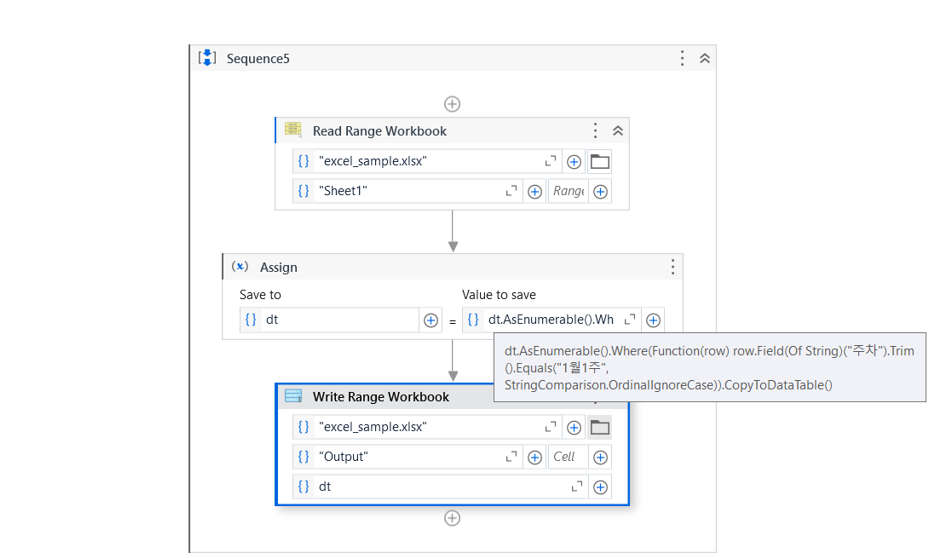요청주신 내용에 필터 데이터테이블 액티비티에 동작에 Contains 로 설정되어있어서 포함하고 있는 텍스트를 전부 가져와서 1월1주차를 원하지만 11월 1주차도 같이 나오는걸로 보이네요