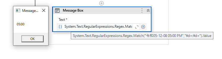 System.Text.RegularExpressions.Regex.Match("令和05-12-08 05:00 PM","\d+:\d+").Value
