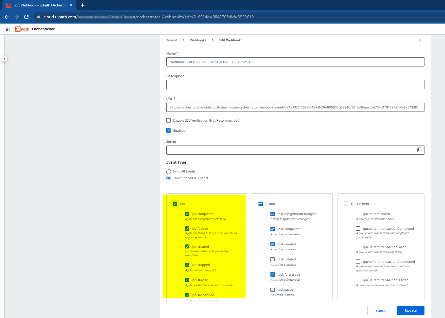The second possibility in your screenshot seems like you can use a UiPath url in the URL field in the Webhook. Would you happen to know where in the UiPath documentation are all the possible UiPath internal urls hat can be used (e.g. like the one in your screenshot “https://orchestrator.mobile.push.uipath.com…”)